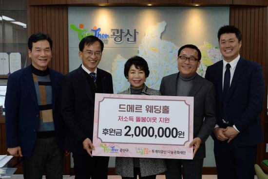 28ÀÏ ±¤»ê±¸ ¼ö¿Ïµ¿ µå¸Þ¸£ ¿þµùȦ(ȸÀå ÀÌõ¿¬)ÀÌ º¹Áö»ç°¢Áö´ë ÀÌ¿ôÀ» À§ÇØ ½á´Þ¶ó¸ç Åõ°Ô´õ±¤»ê ³ª´®¹®ÈÀç´Ü¿¡ 200¸¸¿øÀ» ±âºÎÇß´Ù. |