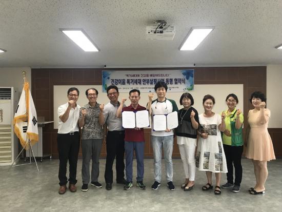 Áö³ 7ÀÏ ±¤»ê±¸ ½ÅÈﵿ Áö¿ª»çȸº¸ÀåÇùÀÇü(À§¿øÀå ¾È»ó¹«)¿Í ¢ßÇ®¹«¿ø³ìÁó ±¤»ê¿ÀÇǽºÁöÁ¡(Á¡Àå ±è¾ç¼ö)ÀÌ ¡®°Ç°ÀÌÀ½»ç¾÷¡¯ Çù¾à½ÄÀ» °®°í, µ¶°Å¼¼´ëÀÇ °Ç°°ú ¾ÈºÎ¸¦ »ìÇDZâ·Î Çß´Ù.