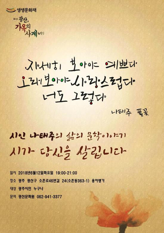 À̳¯ °¿¬È¸´Â ¹®ÈÀçû »ý»ý¹®ÈÀç»ç¾÷ÀÇ Çϳª·Î ±¤»ê±¸ ÁÖÃÖ, ±¤»ê¹®È¿ø ÁÖ°üÀÇ ¡®½ÃÀÎÀÇ »ç°è¡¯ 6¿ù Çà»ç¡¦ |