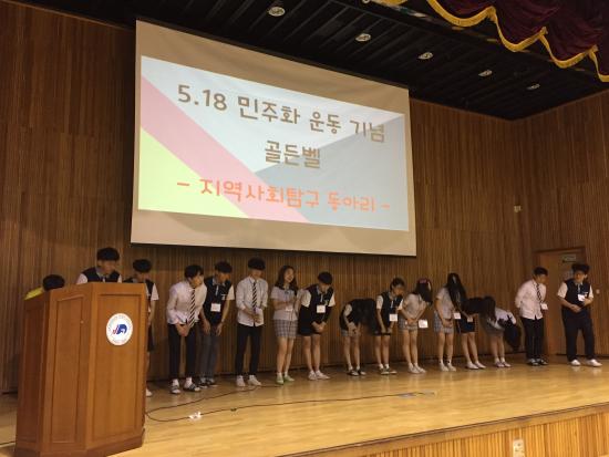 Àå´ö°íµîÇб³(±³Àå À̼ºÃ¶) Áö¿ª»çȸޱ¸ µ¿¾Æ¸®°¡ Áö³ 17ÀÏ Àú³á 5¡¤18 ¹ÎÁÖÈ ¿îµ¿ 38ÁÖ³âÀ» ±â³äÇØ °ñµçº§ ÄûÁî´ëȸ¿Í ¹ÎÁÖÁÖÀǸ¦ À§ÇØ Èñ»ýÇÑ ¿»çµéÀ» Ã߸ðÇÏ°í ±â¾ïÇÏ´Â Ä·ÆäÀΠȰµ¿À» ÁøÇàÇß´Ù.