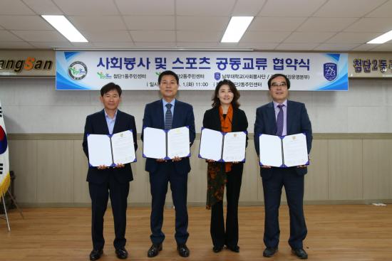 ±¤»ê±¸ ÷´Ü1¡¤2µ¿, ³²ºÎ´ë ±¹Á¦¼ö¿µÀå¿î¿µº»ºÎ, ³²ºÎ´ë »çȸºÀ»ç´ÜÀº »çȸºÀ»ç ¹× ½ºÆ÷Ã÷ µî °øµ¿±³·ù¸¦ À§ÇÑ ¾÷¹«Çù¾àÀ» 1ÀÏ ¸Î¾ú´Ù. Çù¾à½ÄÀº À̳¯ ¿ÀÀü ÷´Ü2µ¿ Áֹμ¾ÅÍ¿¡¼ ¿·È´Ù. Çù¾àÀº Áö¿ª»çȸ ºÀ»ç Çù·Â, ½ºÆ÷Ã÷ µî üÇèȰµ¿¡¦ |