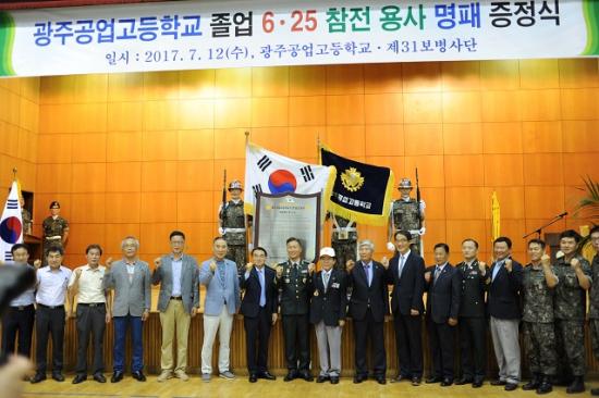±¤ÁÖ°ø¾÷°íµîÇб³(Àå±â¼® ±³Àå)¿Í À°±º Á¦31»ç´Ü(±Ç»ï ¼ÒÀå)ÀÌ Áö³ 12ÀÏ ±¤ÁÖ°ø°í ´ë°´ç¿¡¼ ±¤ÁÖ°ø°í Ãâ½Å 6¡¤25 ÂüÀü ¿ë»çµé¿¡ ´ëÇÑ ¸ð±³ ¸íÆÐÁõÁ¤½ÄÀ» ¿¾ú´Ù.