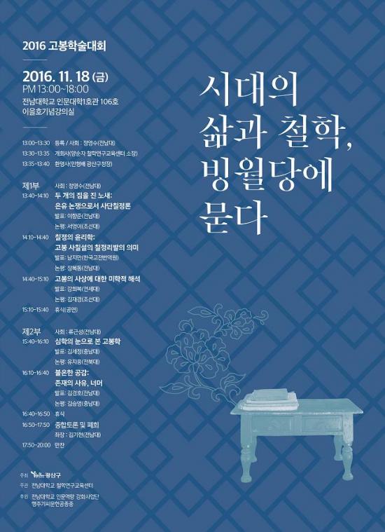 ±¤»ê±¸(±¸Ã»Àå ¹ÎÇü¹è)°¡ 2016 °íºÀÇмú´ëȸ¸¦ ¿À´Â 18ÀÏ ¿ÀÈÄ 1½Ã Àü³²´ëÇб³ Àι®´ëÇÐ1È£°ü ÀÌÀ»È£ ±â³ä°ü¿¡¼ °³ÃÖÇÑ´Ù. ¡®½Ã´ëÀÇ »î°ú öÇÐ, ºù¿ù´ç(Þ¼êÅÓ×)¿¡ ¹¯´Ù¡¯¸¦ ÁÖÁ¦·Î ¿©´Â Çмú´ëȸ´Â 1~2ºÎ¿¡ °ÉÃÄ ÁÖÁ¦¹ßÇ¥ 5°Ç°ú ÀÌ¿¡ ´ë¡¦ |
