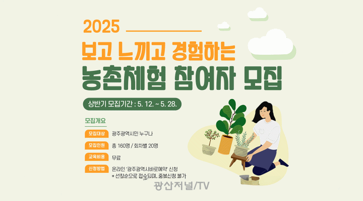±¤ÁֽùÎÀÌ¸é ´©±¸³ª ±¤Áֽà ¡®¹Ù·Î¿¹¾à ´©¸®Áý¡¯(www.gwangju.go.kr/reserve/main.do)¿¡¼ ¹«·á·Î ½ÅûÇÒ ¼ö ÀÖ´Ù. ½Åû ±â°£Àº ¿À´Â 12ÀϺÎÅÍ 28ÀϱîÁöÀ̸ç, ȸÂ÷´ç 20¸í¾¿ ÃÑ 160¸íÀ» ¼±Âø¼øÀ¸·Î Á¢¼öÇÑ´Ù. ±âŸ ±Ã±ÝÇÑ ³»¿ëÀº ±¤ÁÖ³ó¾÷±â¼ú¼¾ÅÍ ´©¸®ÁýÀ» ÂüÁ¶Çϰųª À¶º¹ÇÕÁö¿øÆÀ(062-613-5284)À¸·Î ¹®ÀÇÇÏ¸é µÈ´Ù.