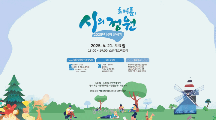 ±¤ÁÖ ±¤»ê±¸(±¸Ã»Àå ¹Úº´±Ô)°¡ 21ÀÏ ¼ÒÃÌ¾ÆÆ®ÆÑÅ丮¿¡¼ ÃÊ¿©¸§ ½ÃÀÇ Á¤¿øÀ̶ó´Â ÁÖÁ¦·Î 2025 ¿ë¾Æ ¹®ÇÐÁ¦¸¦ °³ÃÖÇÑ´Ù. ¿ë¾Æ¹®ÇÐÁ¦´Â ¿ì¸® Áö¿ªÀÇ ´ëÇ¥ ¼Á¤½ÃÀÎ ¿ë¾Æ ¹Ú¿ëö ¼±»ýÀÇ ¹®ÇÐÁ¤½ÅÀ» ±â¸®°í, ½Ã¹Î°ú ÇÔ²² ¹®ÇÐÀ» ´©¸®´Â ¹®ÇÐÃàÁ¦´Ù. Çà»ç´Â ¿¹¼úÀÎÀÌ ÇÔ²²ÇÏ´Â °ø¿¬ ¹«´ë¸¦ ½ÃÀÛÀ¸·Î ±â³ä½Ä, ¿ë¾Æ ½Ã ÀÚÀÛ°î, ½Ã ³¶¼ÛÀ¸·Î ÁøÇàÇÑ´Ù.