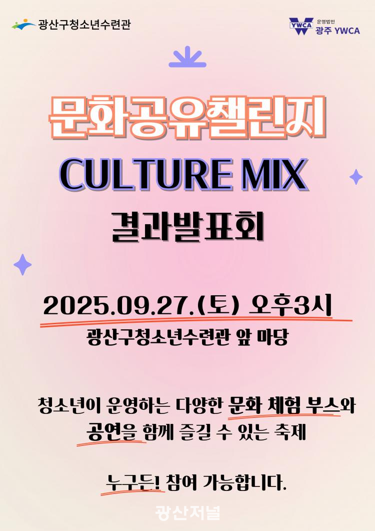 ±¤»ê±¸Ã»¼Ò³â¼ö·Ã°ü °ü°èÀÚ´Â ¡°¹®È°øÀ¯Ã§¸°Áö CULTURE MIX´Â û¼Ò³âÀÌ ÁÖü°¡ µÇ¾î Àç´É°ú ¹®È¸¦ ³ª´©¸ç ¼ºÀåÇÏ´Â °úÁ¤¡±À̶ó¸ç, ¡°À̹ø °á°ú¹ßǥȸ°¡ û¼Ò³âµéÀÇ ¼º°ú¸¦ Áö¿ª»çȸ¿Í ÇÔ²² °øÀ¯Çϰí ÃàÇÏÇÏ´Â ÀÚ¸®°¡ µÇ±æ ¹Ù¶õ´Ù¡±°í ¹àÇû´Ù.